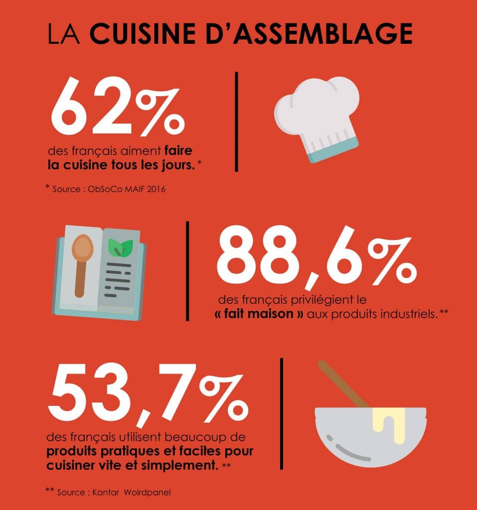 Aujourd’hui, 62 % des Français aiment faire la cuisine tous les jours et 88,6 % privilégient le « fait maison » aux produits industriels 3. Néanmoins la contrainte du temps est de plus en plus forte dans nos modes vies pressés et les Français passent de moins de temps en cuisine. Dans ce contexte, la « cuisine d’assemblage », qui consiste à réaliser un repas complet en associant plusieurs produits semi-élaborés, séduit de plus en plus car elle apporte au consommateur la satisfaction de ne pas céder aux « plats tout prêts » mais plutôt de cuisiner lui-même, tout en gagnant du temps. La cuisine d’assemblage nous assure également d’être maître du contenu de notre assiette, à l’heure où une alimentation saine et transparente est privilégiée.