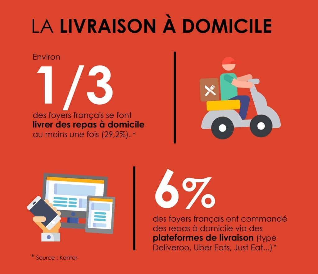 La livraison de repas à domicile présente un potentiel très fort puisqu’elle ne concerne aujourd’hui que 2 % du marché de la restauration en France, et en mars 2019 la part des foyers français qui déclaraient s’être fait livrer à domicile au moins une fois dans l’année des repas était de 29,2 % 5. À noter également qu’à peine 6 % des foyers ont commandé des repas via des plateformes de livraison à domicile (Allo Resto ou Just Eat, Uber Eats…). Avec l’entrée dans la vie active de la nouvelle génération ultraconnectée, ces chiffres pourraient augmenter selon Bernard Boutboul, spécialiste de la restauration (président de Gira Conseil, cabinet spécialisé dans la restauration).